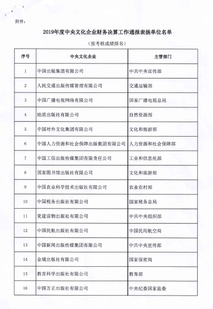 日前財政部發(fā)出《關(guān)于2019年度中央文化企業(yè)財務(wù)決算工作情況的通報》,中國農(nóng)業(yè)科學(xué)技術(shù)出版社在115個中央文化企業(yè)財務(wù)決算評審中排名第九,受到財政部的通報表揚。
